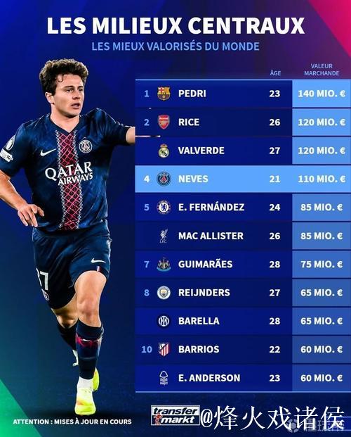 德转中前卫身价世界前10:佩德里1.4亿第1,赖斯、巴尔韦德第2